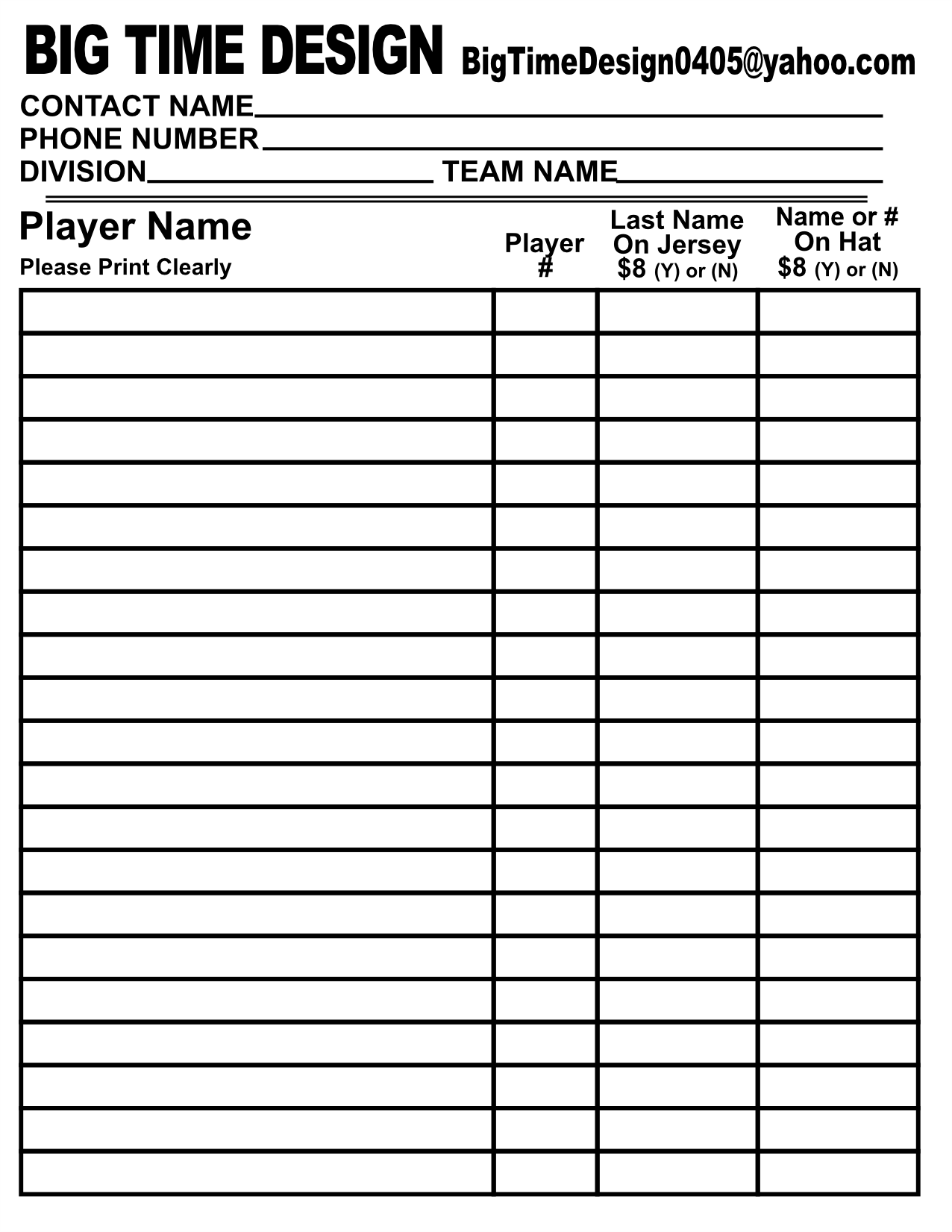 Team Parents - please use the link below to collect the information from the players that would like to add their name to their jersey and/or hat. ONLY ONE parent will need to collect these specific jerserys and hats and take them to Big Time Design.